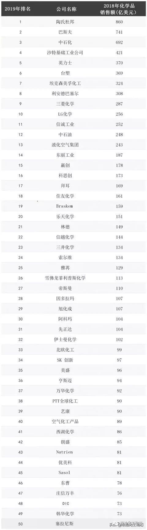 今年位居全球50强榜首的是一家新公司--陶氏杜邦,是2017年陶氏化学和杜邦公司合并的结果,它结束了巴斯夫12年的统治,成为世界上最大的化学公司,但只是暂时的。今年早些时候,陶氏杜邦已经分拆成三家独立的公司:陶氏、杜邦和Corteva Agriscience,陶氏和杜邦一定会出现在明年排名中。那么,巴斯夫肯定会在明年重新夺回头把交椅。