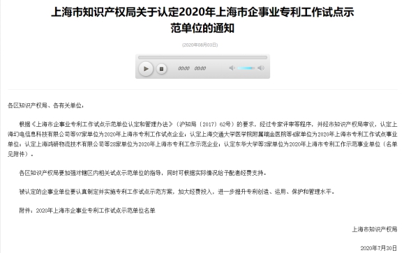上海市知识产权局关于认定2020年上海市企事业专利工作试点示范单位的通知