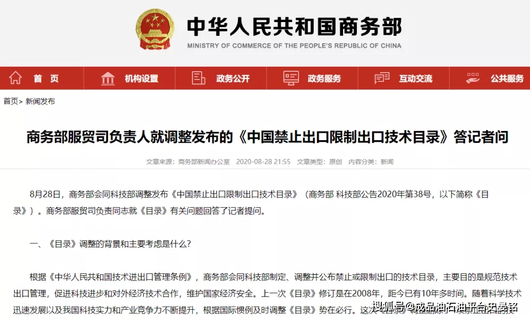 8月28日,商务部、科技部调整发布《中国禁止出口限制出口技术目录》(商务部 科技部公告2020年第38号,以下简称《目录》)。