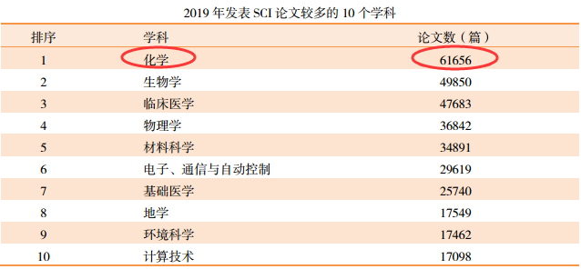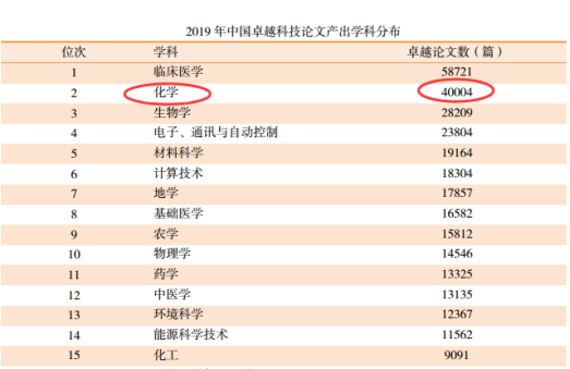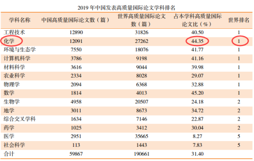 由中国科技论文统计结果——《中国卓越科技论文报告》中可以看出,2019年中国卓越科技论文产出学科中,化学学科是仅次于医学领域的第二大学科,卓越论文数达40004篇。在高质量国际论文统计中,中国化学学科高质量国际论文数量列世界首位,占本学科高质量国际论文比为44.354%。在2010-2020年我国高被引论文中被引次数最高的5 篇国际论文中,化学学科占三席,被引频次达4000余次。