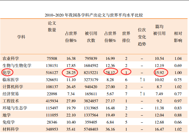 在国际论文的学科分布中,SCI 论文数最多的十个学科中化学学科位列榜首,论文数量达61656篇。由2010-2020 年我国各学科产出论文与世界平均水平比较表可以看出,中国化学学科论文数量占世界份额的28.25%,被引用次数占世界份额的28.12%,世界排名第一。
