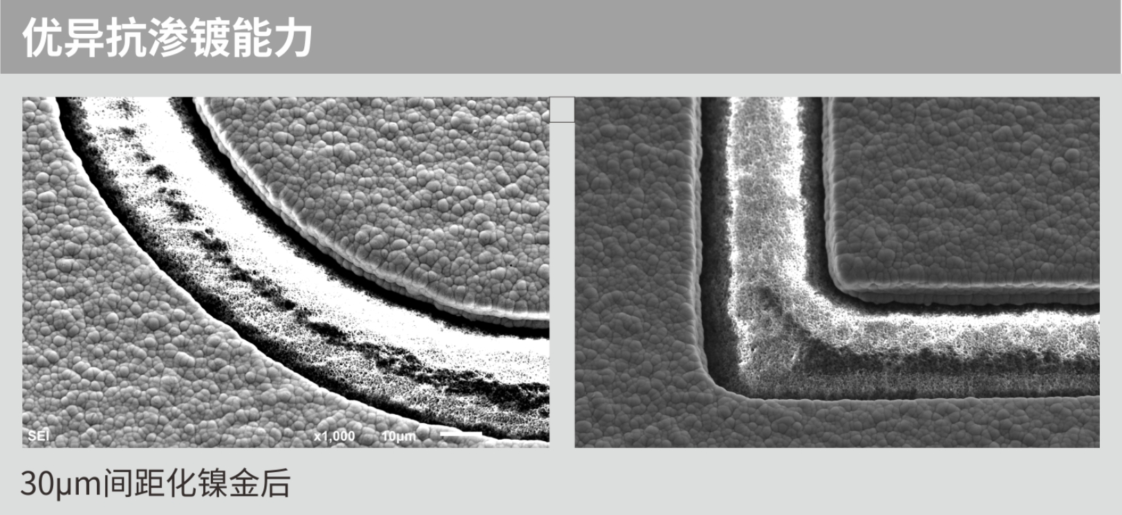 光华科技所研制推出的“5183LMP系列沉镍金”,属于中磷镍系列药水,操作范围宽、镀液稳定、镍腐蚀水准达到IPC一级、对防焊油墨攻击轻微,非常容易管控;该系列药水抗渗镀能力极佳,能够批量生产焊盘间距25-35微米的线路板。经中国电子电路行业协会(CPCA)组织的科技成果鉴定,鉴定专家组认为该产品达到国际先进水平,特别适用于高精密HDI板的制作工艺流程;另外,镍槽药水寿命可达到4.5-5MTO,高于国际同行的3.5-4MTO,因此废液少,对环境友好环保,同时大幅度降低了客户的运营成本。