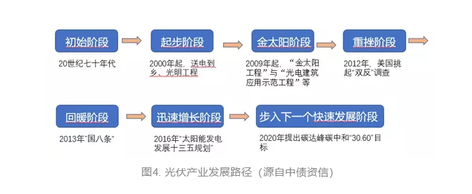 转变能源结构、发展低碳技术是实现“碳中和“的应有之义。在过去十余年,中国先后大力发展了以光伏、风能等产业为代表的清洁能源。其中,光伏发电是利用半导体界面的光生伏特效应而将光能直接转变为电能的一种技术。光伏发电设备主要包括电池组件、支架、逆变器等,即晶硅电池经过串联后进行封装保护构成电池组件,再配合功率控制器等部件形成的发电装置。光伏发电设备行业处于电力产业链的中上游,其辐射链条较长:上游是晶体硅原料的采集和硅棒、硅锭、硅片的加工制造;中游是光伏电池及组件的制造;下游为光伏电站系统的集成和运营。产业链的各个环节共同决定了光伏行业是否可以实现平价上网。2019年以来我国光伏进入平价上网过渡阶段;进入2020年以来,竞价项目度电补贴强度平均下降50%至0.033元/kWh,且共有13省份申报了36.23GW平价光伏项目,同比增加145%,光伏行业开始真正进入大规模平价上网时代。