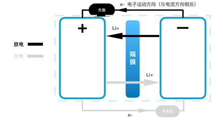 当电路接通,负极固相材料中会发生电化学反应,释放出Li+和电子。它们分两路同时向正极方向迁移。Li+会融入电解液,并穿过隔膜到达正极。电子则通过外部电路到达正极,电子流经负载,即可实现负载对外做功。电子通过集流体直接进入正极固相材料,而Li+则被正极固相材料吸收。锂电池又被称为“摇椅电池”,原因是充电过程的电化学反应与放电过程是相反的。所以在讨论锂电池寿命时,总会提到进行了多少次“循环”。