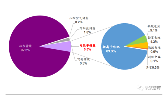 据CNESA全球储能项目库统计,2019年底全球已投运储能项目的累计装机规模为184.6GW,同比+1.9%。不同储能技术来看,抽水蓄能项目的累计装机规模位列第一,为171.0GW,同比+0.2%;电化学储能项目的累计装机规模位列第二,为9520.5MW。电化学储能技术主要包括锂离子电池、铅蓄电池、钠硫电池、液流电池等;其中,锂离子电池的累计装机规模占到电化学储能装机规模的88.8%。