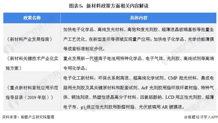 电子化学品作为电子工业中的关键性基础化工材料,被国家列入新材料产业重点培育和发展。其在新材料政策中相关内容如下: