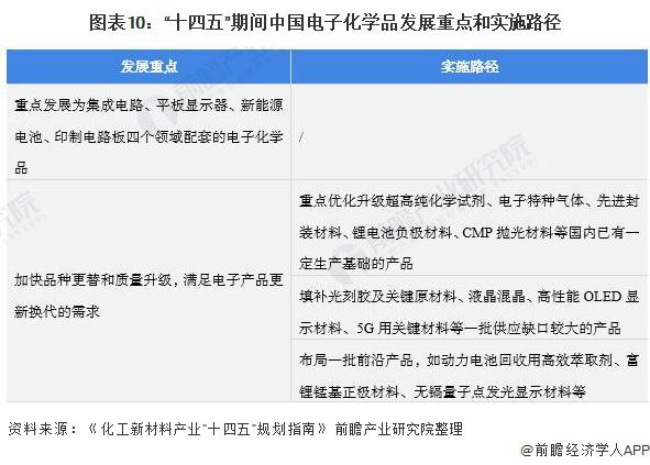 2020 年 7 月 30 日,石油和化工规划研究院发布《化工新材料产业 " 十四五 " 规划指南》,指出十三五期间我国电子化学品表观消费量为 353 万吨,自给率为 70%。并提出 " 十四五 " 期间我国电子化学品发展重点和实施路径:重点发展为集成电路、平板显示器、新能源电池、印制电路板四个领域配套的电子化学品 ; 加快品种更替和质量升级,满足电子产品更新换代的需求。