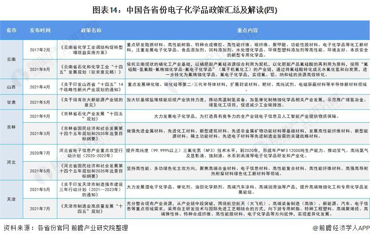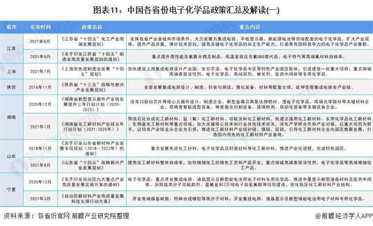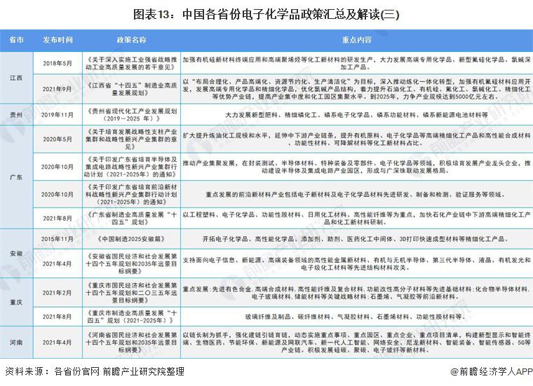 从区域政策来看,各省份也均在 " 十三五 "、" 十四五 " 时期发布了推动电子化学品行业发展的支持性政策,政策内容均围绕发展新型高端电子化学品等目标展开: