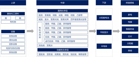 湿电子化学品,又称超净高纯试剂或工艺化学品,是指主体成分纯度大于 99.99%,杂质离子和微粒数符合严格要求的化学试剂,是重要的晶圆制造材料之一,2020 年市场规模占比 4%。主要以上游硫酸、盐酸、氢氟酸、氨水、氢氧化钠、氢氧化钾、丙酮、乙醇、异丙醇等为原料,经过预处理、过滤、提纯等工艺生产得到的高纯度产品。下游应用主要为光伏太阳能电池、平板显示和半导体三大领域,主要应用在集成电路制造的清晰、蚀刻、掺杂、显影、晶圆表面处理、去膜、去光刻胶等工序中。