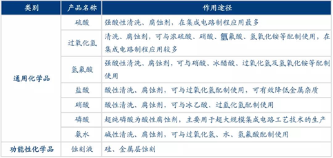 按照用途主要可以将湿电子化学品分为通用化学品和功能性化学品两类。其中通用化学品以高纯溶剂为主,例如过氧化氢、氢氟酸、硫酸、磷酸、盐酸、硝酸等;功能性化学品指通过复配手段达到特殊功能、满足制造中特殊工艺需求的配方类或复配类化学品,主要包括显影液、剥离液、清洗液、蚀刻液等。
