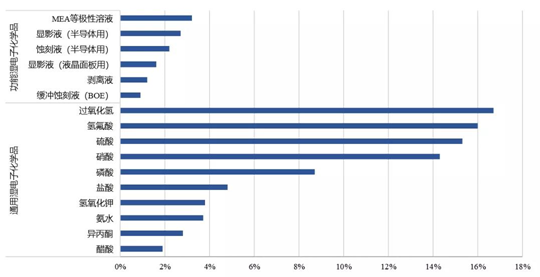 常用的湿电子化学品以通用化学品为主,占比达到 88%,其中过氧化氢、氢氟酸和硫酸需求占比排名前三,占比分别达到 16.7%、16%和 15.3%;功能性化学品中主要为显影液和 MEA 等极性溶液,占比达到了 4.3%和 3.2%。