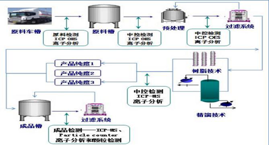 湿电子化学品处在一般工业原料和特殊应用化工材料之间,作为常规生产线之外的必需辅助材料,俗称“工业味精”,应用在平板显示、半导体以及光伏太阳能的加工过程中。在对于湿电子化学品进行制备时主要有三大方面需要严苛的技术或工艺。