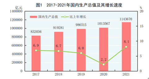2月28日,国家统计局公布2021年国民经济和社会发展统计公报。初步核算,全年国内生产总值1143670亿元,比上年增长8.1%,两年平均增长5.1%。其中,第一产业增加值83086亿元,比上年增长7.1%;第二产业增加值450904亿元,增长8.2%;第三产业增加值609680亿元,增长8.2%。全年人均国内生产总值80976元,比上年增长8.0%。国民总收入1133518亿元,比上年增长7.9%。