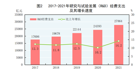 全年研究与试验发展(R&D)经费支出27864亿元,比上年增长14.2%,与国内生产总值之比为2.44%,其中基础研究经费1696亿元。国家自然科学基金共资助4.87万个项目。