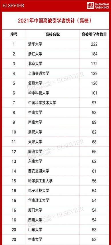 据软科统计,共319所高校有学者入选,其中6所大学的高被引学者数量超过了100位。清华大学共有222位,位居第一;浙江大学共有184位,位居第二;第三名为北京大学172位;第四、五名分别为上海交通大学139位,复旦大学126位。与去年相比,华中科技大学进步明显,位列第六,入选的高被引学者数量为101位。