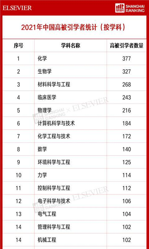 入选的学者共分布在84个不同的学科,其中化学学科高被引学者最多,共377位;生物学、材料科学与工程、临床医学、物理学等学科均超过了200位;超过100位的学科共15个。