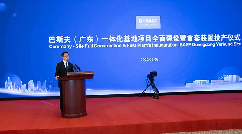 9月6日,德国巴斯夫集团在广东湛江投资的巴斯夫(广东)一体化基地项目举行全面建设暨首套装置投产仪式。中共中央政治局常委、国务院副总理韩正出席并宣布项目全面建设启动暨首套装置投产。