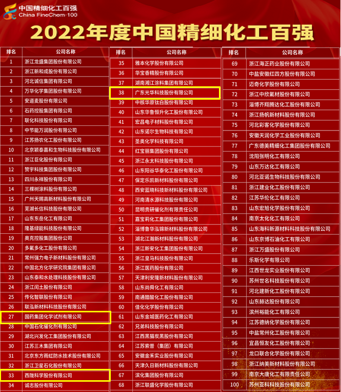 在最新发布的“2022中国精细化工百强”榜单中,试剂行业中的3家优秀企业:国药集团化学试剂有限公司、西陇科学股份有限公司、广东光华科技股份有限公司再度上榜,分别位列榜单的第27名、33名和38名。同时广东光华科技股份有限公司还荣获“2022年度中国精细化工绿色低碳发展企业十强”荣誉称号。