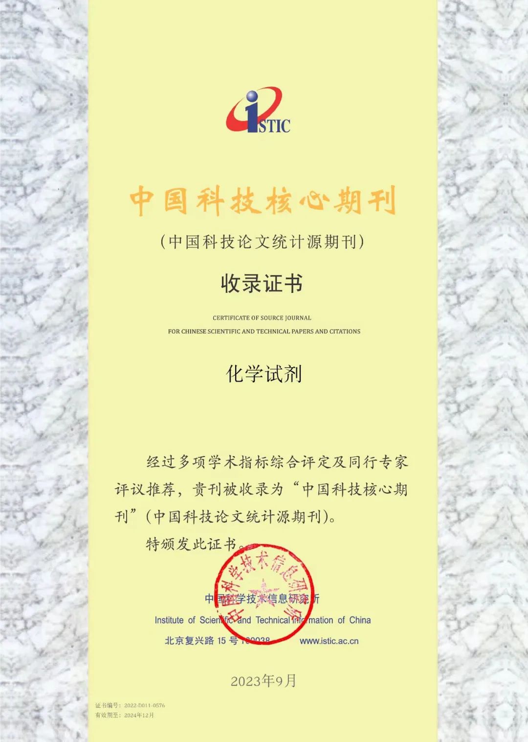 2023年9月20日上午,中国科学技术信息研究所发布了本年度中国科技论文统计报告。《化学试剂》期刊蝉联入选《2023年中国科技核心期刊目录(自然科学卷)》。我们将继续保持初心,不断创新,努力打造一流期刊,促进试剂行业交流,不断提升期刊学术影响力。