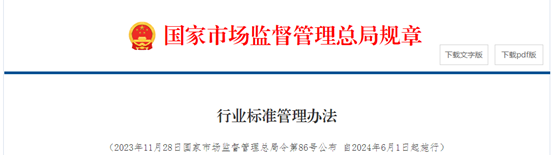 2023年11月28日,市场监管总局颁布第86号令,修订出台了《行业标准管理办法》,将于2024年6月1日起正式施行。
