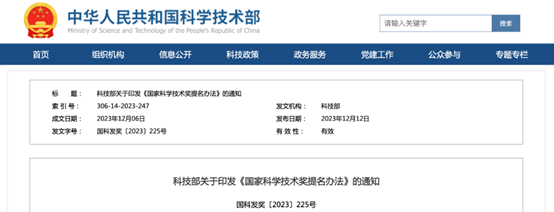 2023年12月12日,科技部发布《国家科学技术奖提名办法》的通知。