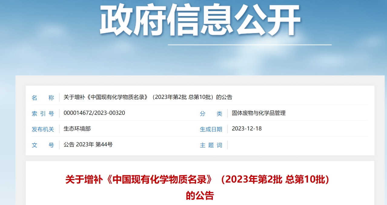 生态环境部根据《新化学物质环境管理登记办法》(生态环境部令第12号)相关规定,按照《关于发布〈新化学物质环境管理登记指南〉及相关配套表格和填表说明的公告》(生态环境部公告2020年第51号)中有关化学物质增补列入《中国现有化学物质名录》的要求,对相关化学物质生产、进口、使用企业、相关行业协会及其他单位提交的申请材料进行了审核和公示。