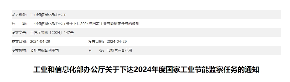 按照《工业和信息化部办公厅关于组织开展2024年度工业节能监察工作的通知》(工信厅节函〔2024〕40号,以下简称《通知》),在省级工业和信息化主管部门报送基础上,我部确定了2024年度国家工业节能监察任务。有关事项通知如下: