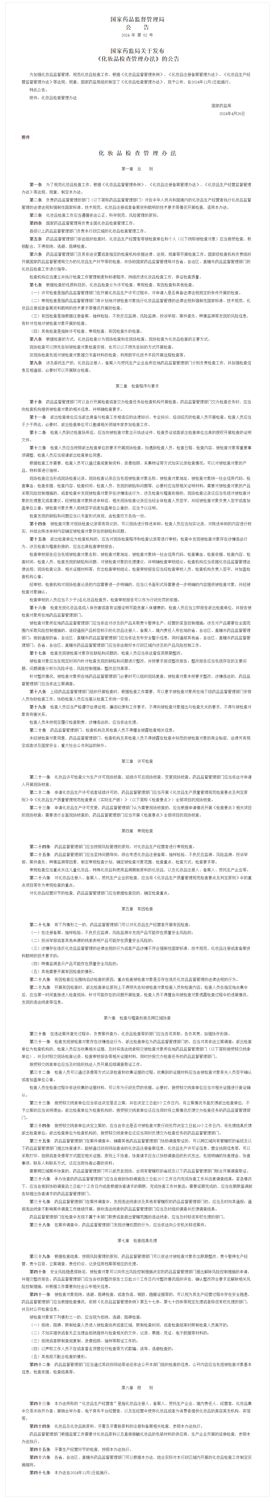 国家药监局发布了《化妆品检查管理办法》,这是我国化妆品监管领域第一次系统地规范化妆品 检查工作的规范性文件,自 2024 年 11 月 1 日起施行。