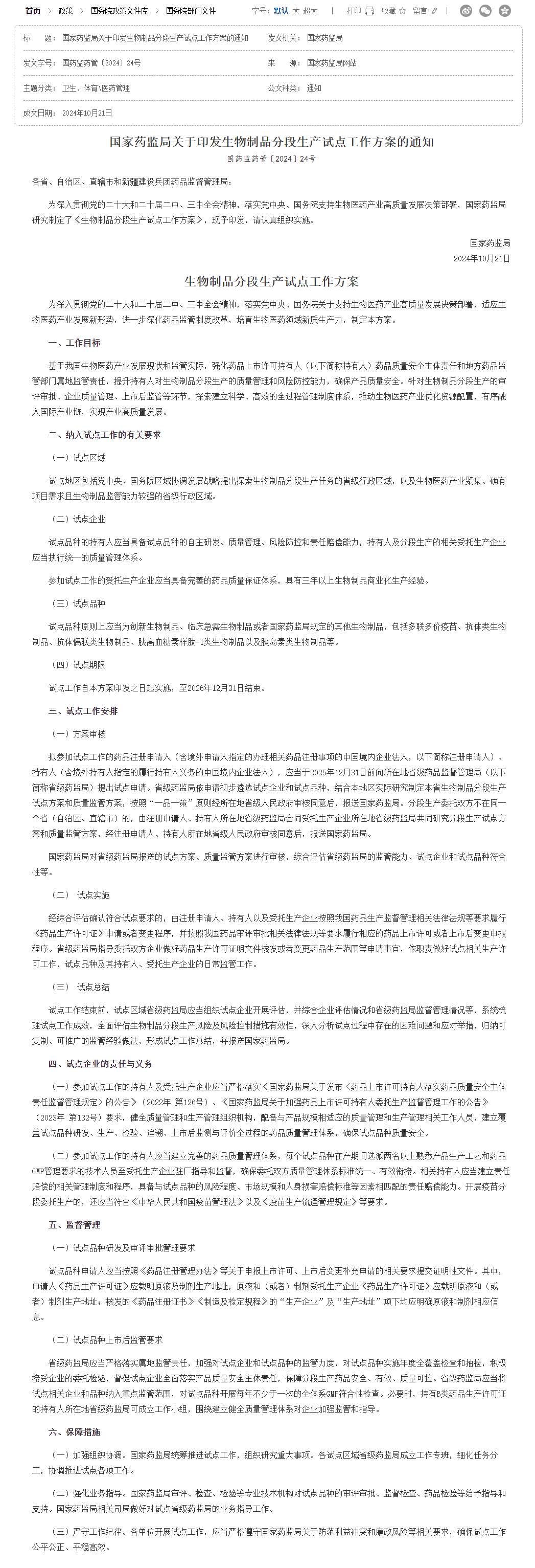10 月 22 日,为深入贯彻党的二十大和二十届二中、三中全会精神,落实党中央、国务院支持生 物医药产业高质量发展决策部署,国家药监局研究制定了《生物制品分段生产试点工作方案》,试点工 作基于我国生物医药产业发展现状和监管实际,积极回应产业发展需求,以委托生产方式探索部分创 新、临床急需等生物制品的分阶段生产,有利于进一步激发企业研发创新活力,促进药品研发生产专业 化分工,提升创新和临床急需生物制品的供应保障能力,更好满足广大群众用药需求。