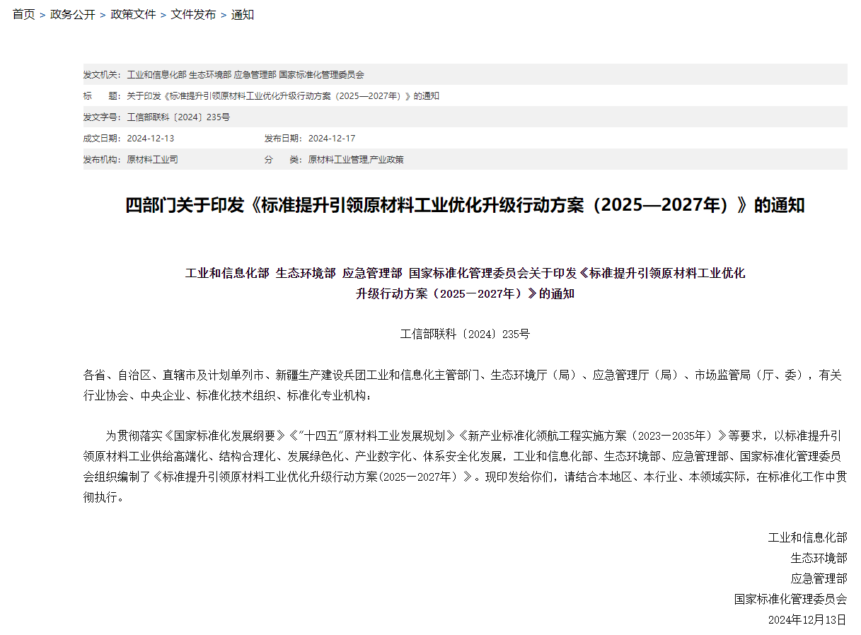 12月17日,工信部等四部门联合印发了《标准提升引领原材料工业优化升级行动方案(2025—2027 年)》(以下简称《行动方案》),为我国以标准提升引领原材料工业供给高端化、结构合理化、发展绿色化、产业数字化、体系安全化发展指明了方向。