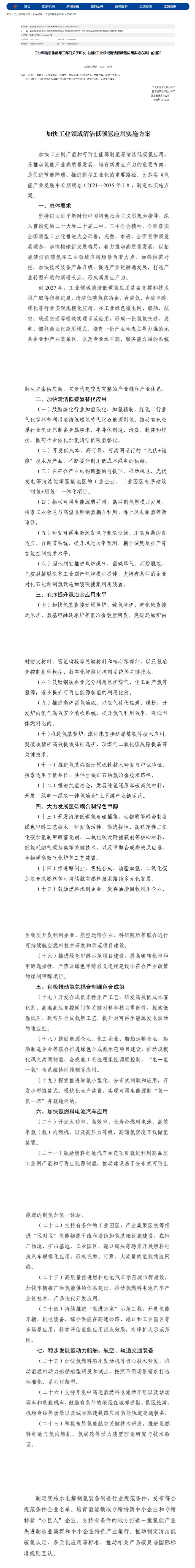 12月31日,工业和信息化部网站发布了工业和信息化部办公厅、国家发展改革委办公厅、国家能源局综合司等三部门关于印发《加快工业领域清洁低碳氢应用实施方案》的通知。