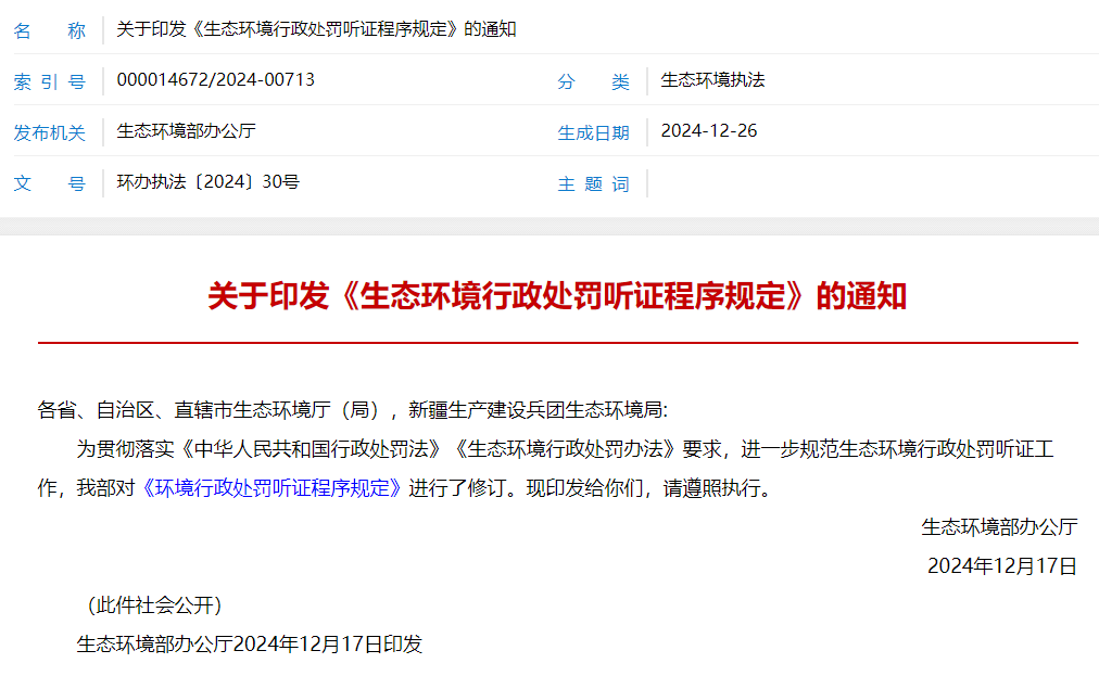 为进一步规范生态环境行政处罚听证工作,生态环境部对《生态环境行政处罚听证程序规定》进行了修订。本规定自2025年3月1日起施行。