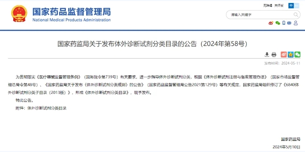 2024年5月10日,国家药品监督管理局发布了新版《体外诊断试剂分类目录》,共计1852项产品,其中三类体外诊断试剂331项,二类体外诊断试剂683项,一类体外诊断试剂838项。