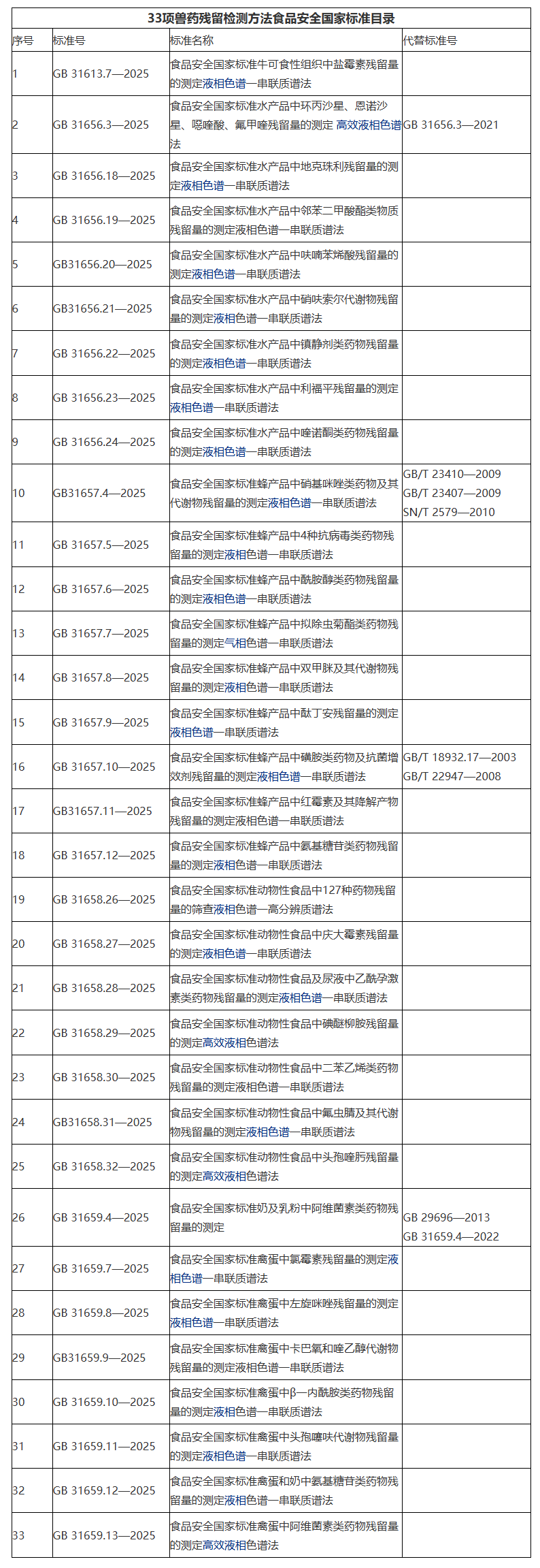 由全国兽药残留专家委员会办公室组织制修订的《食品安全国家标准 水产品中喹诺酮类药物残留量的测定 液相色谱-串联质谱法》等33项标准,于2025年6月3日经农业农村部、国家卫生健康委员会和国家市场监督管理总局联合公告第906号发布,自2025年9月1日起实施。