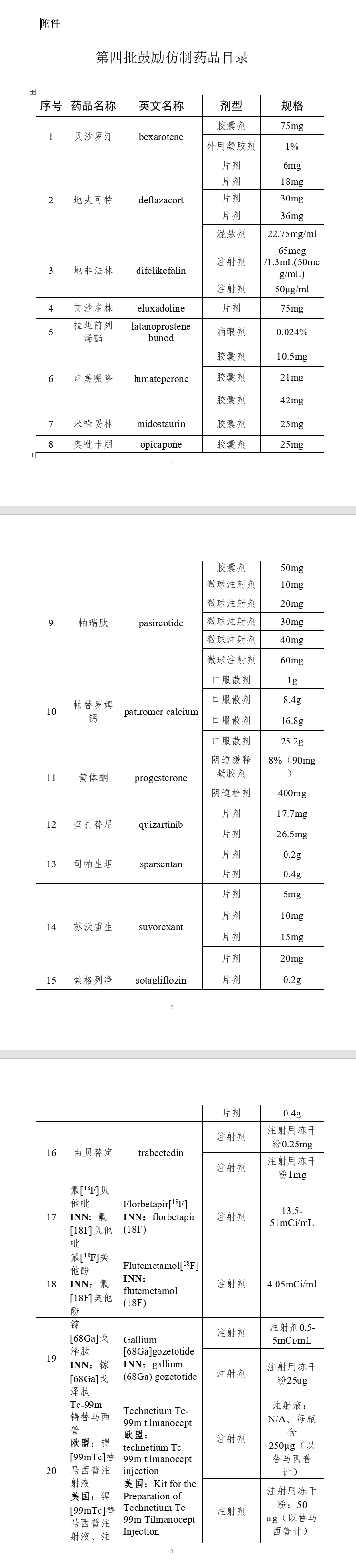 为落实国务院办公厅《关于改革完善仿制药供应保障及使用政策的意见》有关制定鼓励仿制药品目录的部署和要求,国家卫生健康委联合工业和信息化部、国家知识产权局、国家医保局、国家药监局等部门组织专家对国内专利即将到期及临床供应短缺(竞争不充分)的药品进行遴选论证,制定了《第四批鼓励仿制药品目录》。现印发给你们,请推动相关工作开展。各相关部门要按照有关规定,在临床试验、关键共性技术研究、优先审评审批、生产供应保障等方面予以支持。