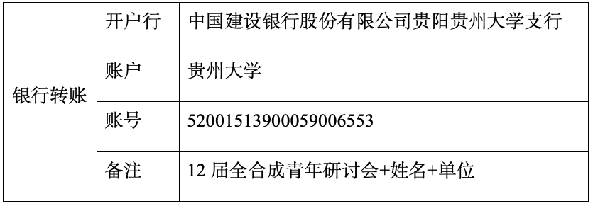 (1)银行汇款请附言注明:参会人姓名、单位全称、单位纳税人识别号、注册费、联系方式及“12届全合成青年研讨会+姓名+单位”字样(方便核对汇款人信息和开具发票)。合并汇款的请说明开发票方式(单开还是合开,不说明视为开一张发票)。汇款后请务必将会议汇款回执单:参会人姓名,单位全称,单位纳税人识别号,发送到totalsynthesis@gzu.edu.cn。