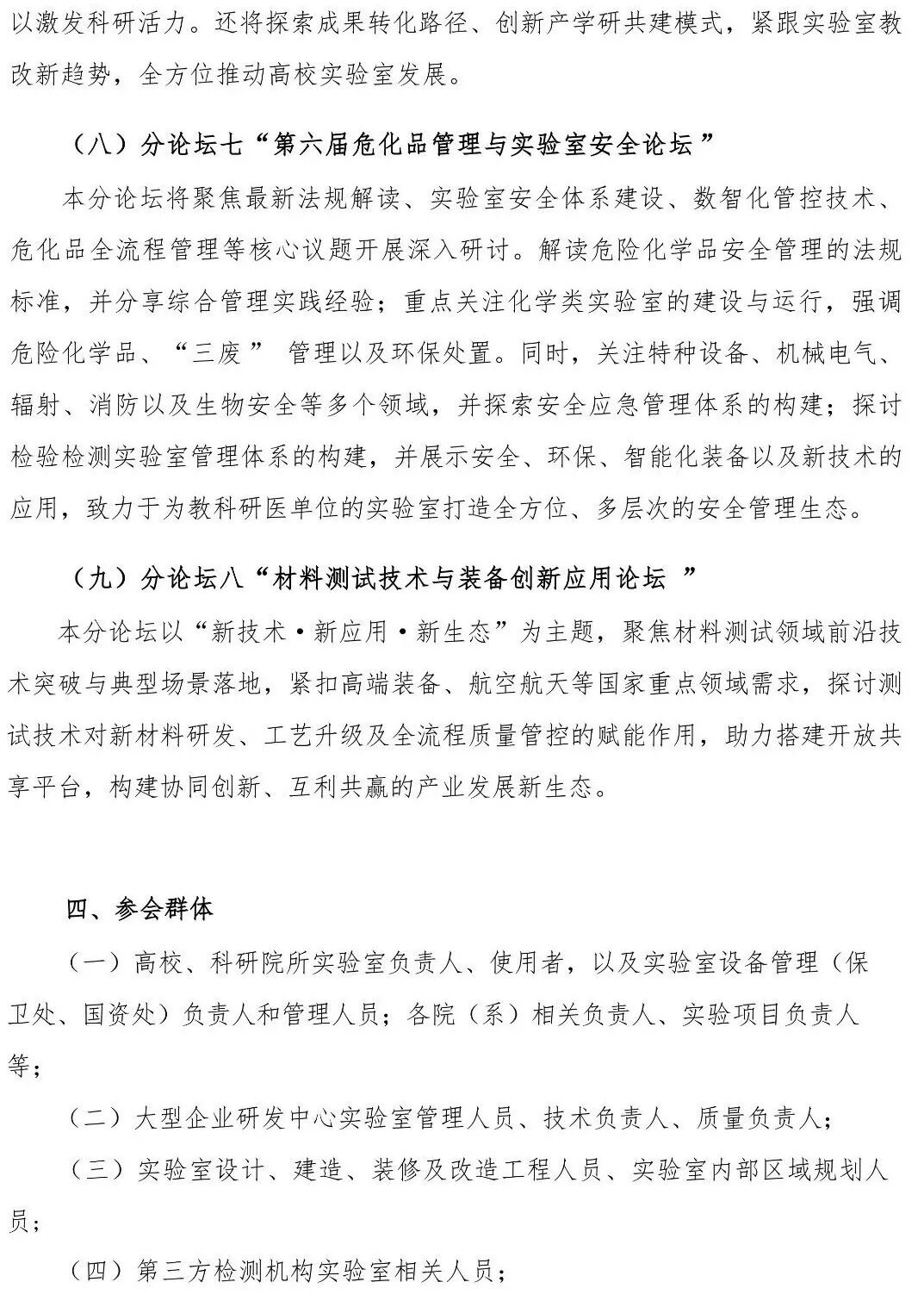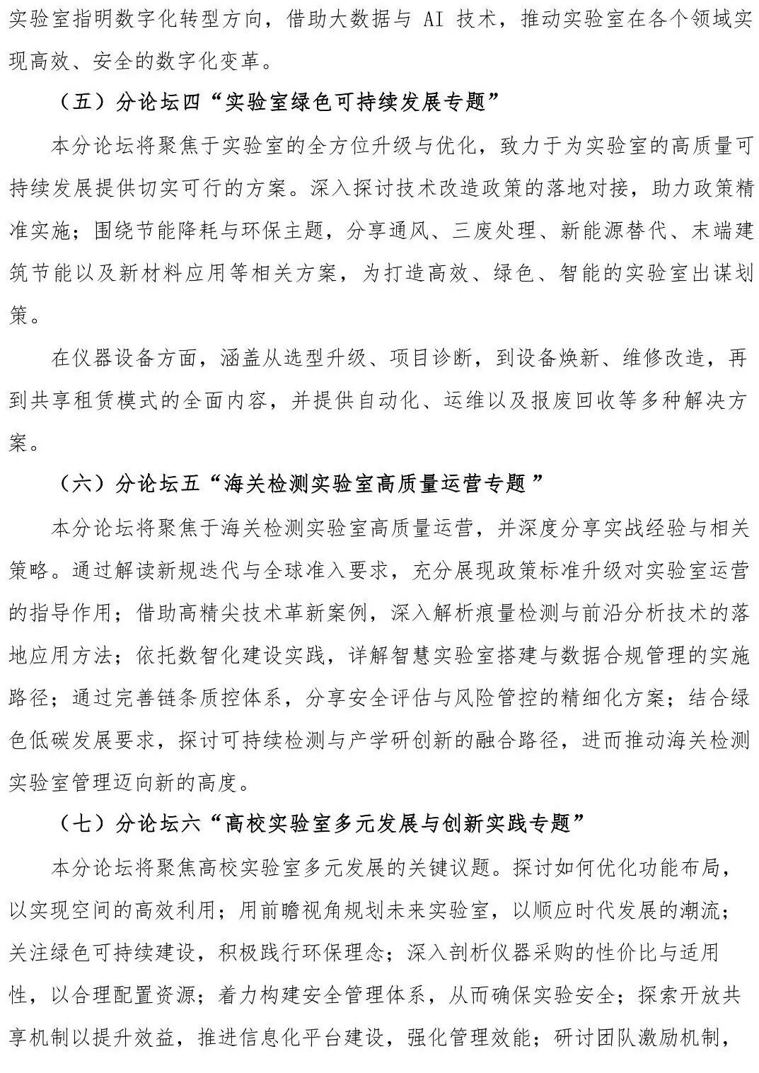 本次分论坛将聚焦最新法规解读、实验室安全体系建设、数智化管控技术、危化品全流程管理等核心议题开展深入研讨。解读危险化学品安全管理的法规标准,并分享综合管理实践经验;重点关注化学类实验室的建设与运行,强调危险化学品、“三废 ” 管理以及环保处置。同时,关注特种设备、机械电气、辐射、消防以及生物安全等多个领域,并探索安全应急管理体系的构建;探讨检验检测实验室管理体系的构建,并展示安全、环保、智能化装备以及新技术的应用,致力于为教科研医单位的实验室打造全方位、多层次的安全管理生态。