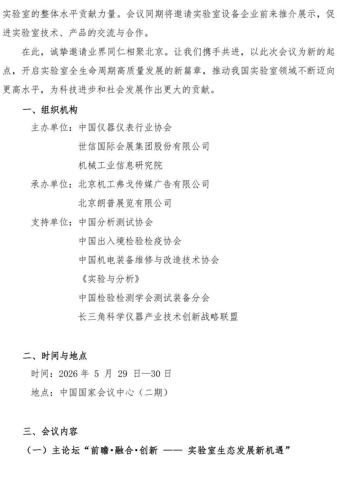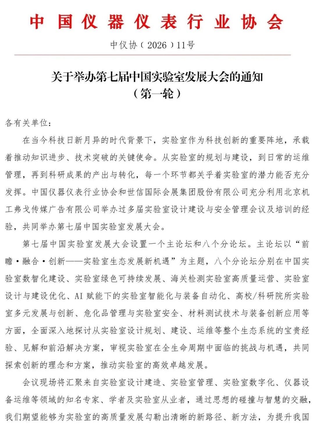 在当今科技日新月异的时代背景下,实验室作为科技创新的重要阵地,承载着推动知识进步、技术突破的关键使命。从实验室的规划与建设,到日常的运维管理,再到科研成果的产出与转化,每一个环节都关乎着实验室的潜力能否充分发挥。由中国仪器仪表行业协会和世信国际会展集团股主办的第七届中国实验室发展大会将于2026年5月29-30日在国家会议中心二期举办!诚挚邀请业界同仁相聚北京,共襄盛举!