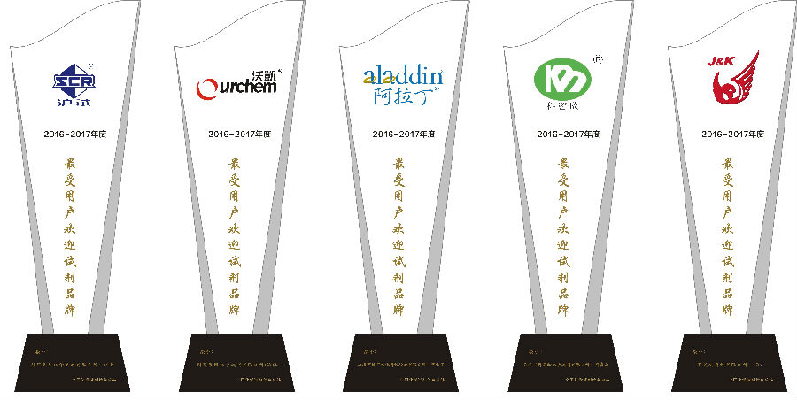 获得2017年度中国试剂优秀品牌的是:国药集团化学试剂有限公司“沪试”、上海阿拉丁生化科技股份有限公司“阿拉丁”、百灵威科技有限公司“J&K”、天津市科密欧化学试剂有限公司“科密欧”、国药集团化学试剂有限公司“沃凯”。