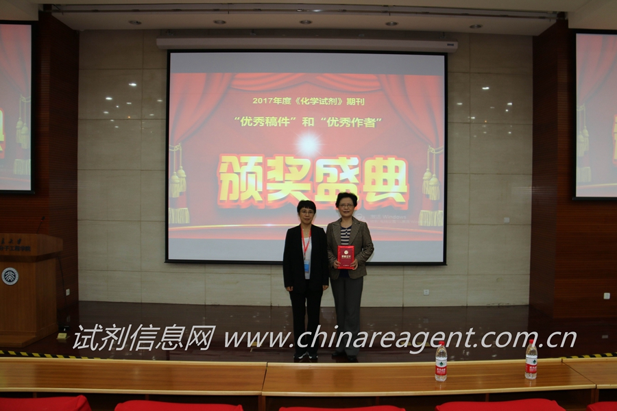为鼓励深入、严谨、求实的学术作风,进一步提升《化学试剂》期刊的理论水平和实用价值,《化学试剂》编辑部组织开展了2017年度“优秀稿件”“优秀作者”评选活动。本次评选在参考了科技论文数据统计机构2016、2017年影响力统计分析数据的基础上,主要依据文章的总被引频次、下载量、来源、内容质量等方面综合评价,分别评选出5篇文章获得了2017年度“优秀稿件”称号。依据作者近几年向我刊投稿文章的频率、质量等,评选出5位作者获得2017年度“优秀作者”称号。《化学试剂》期刊主编何晖女士为优秀稿件和优秀作者获奖代表颁奖。(获奖名单详见报道:《化学试剂》期刊2017年度“优秀稿件”“优秀作者”评选结果揭晓http://www.chinareagent.com.cn/zxgg/9370.jhtml)