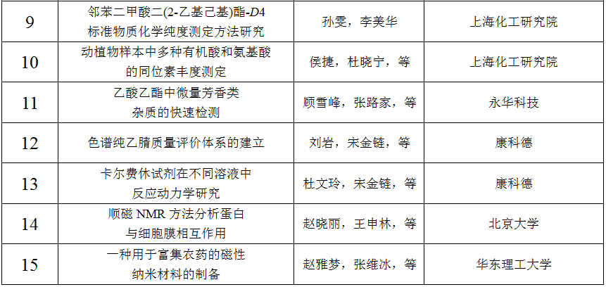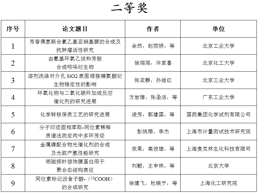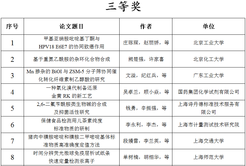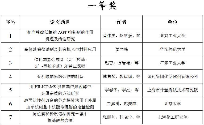 为奖励作者的科研成果,激发科研工作者的研究热情,更好的促进化学试剂的发展,第十二届全国试剂与应用技术交流会“国药杯”科技论文评奖活动面向相关企业、高校以及科研院所征集论文摘要61篇。共19家重点高校、优秀企业、科研院所中的近200位科研人员、教师、学生积极参与了本次活动。主办方特邀请试剂领域专家组成评审团对论文摘要进行评选,共评选出31篇论文摘要予以奖励,其中:一等奖7名,二等奖9名,三等奖15名。