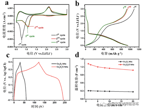 c、d为超级电容性能图[31],曲线1和2分别为Co3O4NAs和Co3O4/CNAs