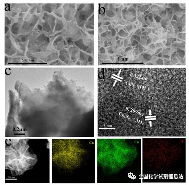 a、b为SEM;c、d为TEM和高分辨TEM图谱;e为元素分布图