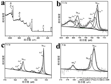 a. XPS全图谱;b~d为Co2p、Cu2p、S2p的XPS拟合峰