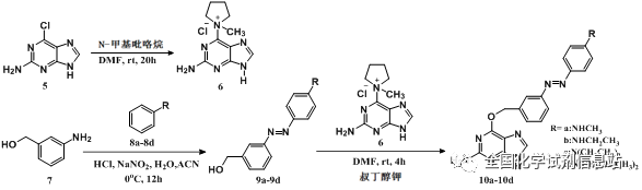 引言 O6-烷基鸟嘌呤-DNA烷基转移酶(AGT)是一种重要的DNA修复酶,AGT可将DNA鸟嘌呤O6位上的甲基、氯乙基和苄基等烷基基团转移至自身第145位半胱氨酸残基上,所以AGT在保护正常细胞DNA不受烷化剂损伤的同时,也能够修复抗癌烷化剂对肿瘤细胞DNA的损伤,进而导致抗肿瘤药物的耐药性。氯乙基亚硝基脲(CENUs)通过诱导DNA形成dG-dC股间交联使癌细胞凋亡从而发挥抗癌效果,常用于治疗脑瘤、恶性黑色素瘤、恶性淋巴瘤等。研究表明,AGT通过修复CENUs导致的O6-氯乙基鸟嘌呤和N1,O6-桥亚乙基鸟嘌呤,阻断了这两种烷化产物进一步与胞嘧啶反应形成DNA股间交联,使得CENUs不能发挥DNA股间交联作用,导致肿瘤细胞对CENUs产生耐药性,最终导致CENUs不能有效抑制肿瘤细胞。为了降低CENUs的耐药性,临床上常辅以AGT抑制剂来降低肿瘤细胞中的AGT水平,提高肿瘤细胞对CENUs的敏感性,从而达到提高CENUs化疗效果的目的。然而,现有的AGT抑制剂不具有肿瘤靶向性,这使其在抑制肿瘤细胞AGT活性的同时也抑制了正常细胞中AGT的活性,导致CENUs的毒副作用显著增强。因此,设计具有肿瘤靶向性的新型AGT抑制剂是解决上述问题的关键所在。O6-苄基鸟嘌呤(O6-BG)(1)是临床上常用的AGT抑制剂,O6-BG可作为AGT的假底物与肿瘤细胞中的AGT发生作用,阻断AGT对CENUs导致的O6-烷基鸟嘌呤的修复作用,从而提高肿瘤细胞对CENUs的敏感性,最终消除或降低CENUs的耐药性。 结论 偶氮基团作为低氧激活触发器应用于肿瘤靶向药物或探针的开发已受到越来越多的关注。本文以偶氮键作为低氧激活基团,合成了4种偶氮苯类低氧激活AGT抑制剂。该类化合物能够特异性地在低氧条件下发生偶氮键断裂释放出O6-BG类似物ABG,进而可以靶向性地抑制实体瘤低氧微环境中的AGT活性,从而降低AGT介导的肿瘤细胞耐药性,提高烷化剂类化疗药物的治疗效果。该类化合物今后不仅可以用于与非靶向性抗癌烷化剂的联合化疗,而且可利用偶氮键的低氧激活特性,连接其它具有抗肿瘤活性的药效团或探针基团,用于肿瘤特异的多靶点抗肿瘤药物、光动力疗法或诊断试剂的开发,为开发新型靶向性抗肿瘤药物以及设计高效低毒的联合用药策略提供了新的思路。 目录 1 实验部分 1.1 主要仪器与试剂 1.2 化合物的合成 a. R=NHCH3;b. R=NHCH2CH3;c. R=N(CH2CH3)2;d. R=N(CH2CH2CH3)2 化合物10a~10d的合成路线 1.2.1 1-(2-氨基-9氢-嘌呤-6)-1-甲基吡咯烷氯化物(6)的合成 1.2.2 (E)-(3-((4-(甲基氨基)苯基)二氮烯基)苯基)甲醇(9a)的合成 1.2.3 (E)-(3-((4-(二乙基氨基)苯基)二氮烯基)苯基)甲醇(9b)的合成 1.2.4 (E)-6-((3-((4-(甲基氨基)苯基)二氮烯基)苄基)氧基)-9H-嘌呤-2-胺(9c)的合成 1.2.5 (E)-6-((3-((4-(二乙基氨基)苯基)二氮烯基)苄基)氧基)-9H-嘌呤-2-胺(9d)的合成 1.2.6 (E)-(3-((4-(乙基氨基)苯基)二氮烯基)苯基)甲醇(10a)的合成 1.2.7 (E)-(3-((4-(二丙基氨基)苯基)二氮烯基)苯基)甲醇(10b)的合成 1.2.8 (E)-6-((3-((4-(乙基氨基)苯基)二氮烯基)苄基)氧基)-9H-嘌呤-2-胺(10c)的合成 1.2.9 (E)-6-((3-((4-(二丙基氨基)苯基)二氮烯基)苄基)氧基)-9H-嘌呤-2-胺(10d)的合成 1.3 化合物10a~10d的Zn/EDTA还原实验 化合物10a~10d在低氧条件下的多步单电子还原反应机理 1.4 低氧和常氧条件下化合物10a~10d在酶体系中的还原反应 2 结果与讨论 2.1 目标化合物的合成 2.2 Zn/EDTA反应体系中还原产物的测定 2.3 HPLC-MS法测定低氧和常氧条件下化合物10a~10d在酶体系中的还原产物 ■ 低浓度药物组;□ 高浓度药物组 图4 混合酶体系中化合物在低氧与常氧条件下生成ABG的浓度之比 3 结论