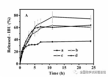 引言 刺激响应性聚合物因其具备特有的环境敏感行为近年来在药物缓控释领域中已经得到广泛应用,但是载药量较低这一缺陷又严重限制了它的推广。介孔二氧化硅由于其均一的孔道结构、可调孔径大小以及高比表面和容易进行表面修饰等一系列优势,被视作一种新的优良药物载体。尤其是通过表面嫁接上述聚合物后所得到的杂化材料既具有较高的载药性能,又对外界环境有敏感性,一度引起大家广泛关注。但是,药物分子的吸附和扩散机制是影响其传递性能的两个主要方面,即内部介孔通道具有的“限域效应”和外表面聚合物对药物递送的“表面效应”,目前却鲜有报道。双模型介孔二氧化硅(BMMs)具有3 nm左右的蠕虫状一级孔和10 ~ 30 nm左右的球形颗粒堆积孔。最近,本课题组以BMMs为载体,通过氨基改性和表面嫁接聚丙烯酸(PAA)或聚N-异丙基丙烯酰胺共聚丙烯酸(P(NIPAM-co-AA)),并以IBU为模型药物,深入考察了复合材料的制备化学规律(如介孔分布、结构尺寸以及聚合物形态和官能团种类)及其对载药行为和释放动力学的影响,结果表明 “限域效应”和“表面效应”对药物分子吸附和扩散现象都起着非常重要的作用,但它们的本质机制却尚不明确。另外,这些杂化介孔SiO2作为载体虽然具有较高的载药量和较好的控释性能,但是无法检测其在特定的生物体内位置和确切时间内的药代动力学行为。基于此,我们曾采用荧光分子1,8-萘二酸酐(NA)负载到BMMs表面,发现其发光性能同样受上述“限域效应”和“表面效应”的较强影响。本文选用致密的纳米SiO2作为载体,通过氨基改性其表面并引入较大的荧光分子3,4,9,10-苝四羧酸酐(PTD)以及pH敏感性聚合物(PAA)形成有机-无机杂化材料,并用IBU作为模型药物,采用各种表征方法,如扫描电子显微镜(SEM)、透射电子显微镜(TEM)、傅里叶变换红外光谱仪(FT-IR)、热重分析仪(TGA),详细讨论了表面效应对IBU装载和控释过程的作用机理及其荧光分子和聚合物稳定性与纳米二氧化硅表面微环境的相互关系。 结论 通过表面改性和嫁接手段成功制备出APTES-DNSS、PTD@DNSS和PAA@DNSS三种有机-无机杂化材料。XRD、TEM、FT-IR、TG、PL等各种表征结果说明这些制备过程并不能改变DNSS大约250nm的球形特征。但是随着PTD嫁接的增加,样品PTD@DNSS分别在400nm和450 nm附近均出现两个发射峰,表现出较强的荧光性能。样品PAA@DNSS载药后其释放具有pH响应性,在碱性条件下(pH7.4)不仅释放量明显大于酸性条件(pH3.0),而且在释药过程中保持着较强的发光性能,进一步证明在DNSS表面所引入的PTD和PAA对药物释放性能和发光行为存在着较强的表面效应。这些结果为后续研究药物分子通过表面效应对其在载体表面吸附和扩散行为的影响,以及在生物体内药代动力学机理提供了重要的参考依据。 目录 1 实验部分 1.1 主要仪器与试剂 1.2 实验过程 1.2.1 PAA的制备 1.2.2 纳米DNSS的表面功能化 1.2.3 荧光杂化材料的合成 1.2.4 pH敏感型聚合物和荧光分子包裹DNSS杂化材料的合成 1.2.5 载药和释放 1.3 表征方法 2 结果与讨论 2.1 XRD分析 a. DNSS; b.APTES-DNSS;c. PTD@DNSS-0.05; d. PTD@DNSS-0.5; e. PTD-DNSS-1; f. PTD@DNSS-5; g. PTD@DNSS-10;h. PAA@DNSS-5; i. I-PAA@DNSS-5 图1 样品的XRD谱图 Fig.1 XRDpatterns of related samples 2.2 SEM分析 2.3 FT-IR分析 a.DNSS; b. PTD @DNSS-5; c. PAA@DNSS-5 图3 样品的FT-IR谱图 Fig.3 FT-IRspectra of samples 2.4 TG分析 a.PTD @DNSS-5; b. PAA@DNSS-5; c. I-PAA@DNSS-5 图4 样品的TG图 Fig.4 TGcurves of samples 2.5 PL分析 a. PTD@DNSS-0.05;b. PTD@DNSS-5; c. PTD@DNSS-10; d. PAA@DNSS-5; e. I-PAA@DNSS-5 图5 样品的荧光光谱 Fig.5 PL spectra of the related samples 2.6 I-PAA@DNSS-5和I-APTES-DNSS的释放行为及其荧光性能 a. 样品I-PAA@DNSS-5和I-APTES-DNSS的pH敏感释放性能:pH 3.0: 1. I-PAA@DNSS-5, 2.APTES-DNSS; pH 7.4:3. I-PAA@DNSS-5,4. APTES-DNSS;b. 样品I-PAA@DNSS-5在pH 7.4的PBS条件下释放过程中的荧光光谱 图6 不同pH缓冲溶液中样品I-PAA@DNSS-5和APTES-DNSS的药物释放行为及其荧光性能 Fig. 6 Drug release behavior and its fluorescenceproperties of I-PAA@DNSS-5 and APTES-DNSS in Different pH buffer solutions 3 结论