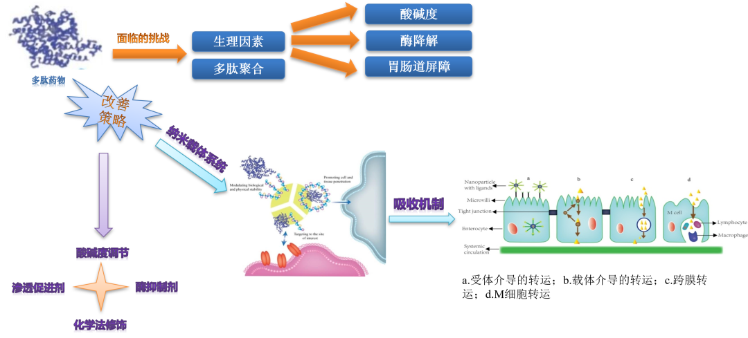 通过多肽药物的口服给药进行综述、介绍了多肽类药物面临的挑战及改善其口服稳定性的策略;