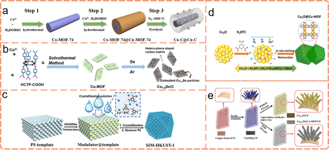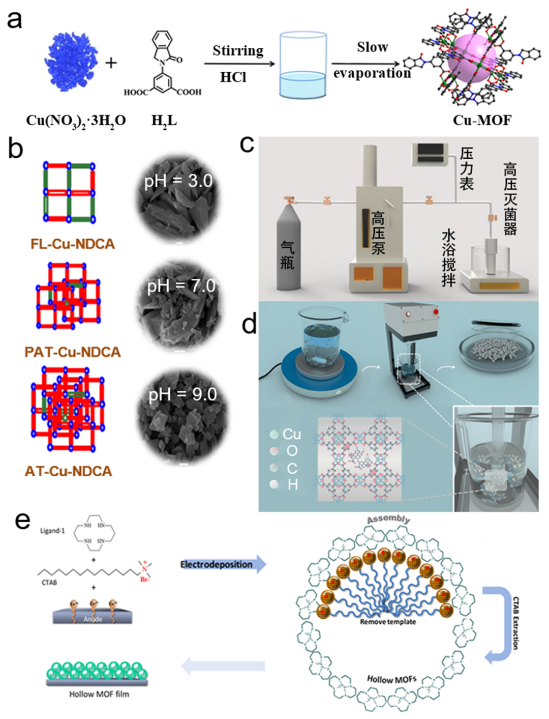 MOF中金属元素和有机配体的种类及配位方式的多样性,使得MOF的骨架结构具有无限可能。在此,以Cu-MOF为例,简要介绍了MOF材料的常用合成方法(图2)。