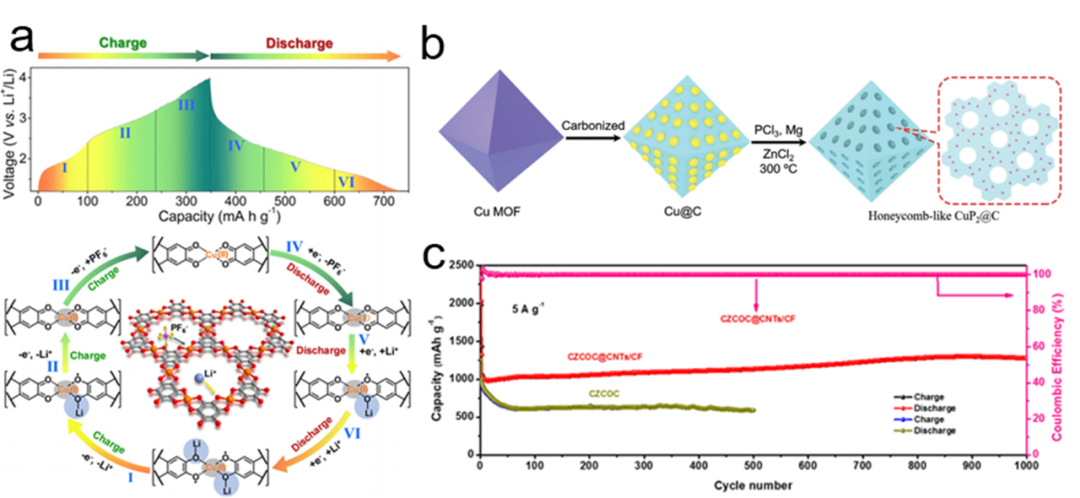 锂离子电池(Lithiumion batteries,LIBs)具有能量密度高、循环稳定性好、安全环保等优势,已经在诸多领域中实现了广泛应用。丰富的孔隙率和本征的氧化还原特性赋予其良好的电化学活性。通过综合光谱技术证明了每个配位单元3个电子氧化还原反应和每个铜离子1个电子氧化还原反应的机理(图4a)。