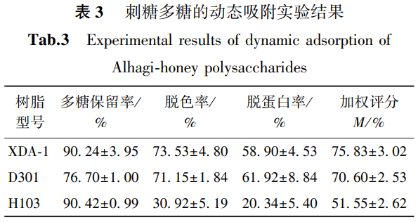 树脂的动态吸附实验结果见表3,由表3可知高交联度、高比表面积、不带有官能团的非极性聚合物型树脂XDA-1的加权评分M值评分最高,H103型树脂脱蛋白率效果较差。